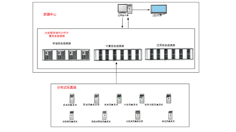 System hardware includes distributed collection server,big data memory& analytical computing server cluster,application client and LED display.Distributed collection server converts field industrial data storage interface into big data platform reading interface.Big data platform carries out data secure storage and management,analytical computing server takes charge of data reading, processing,calculating and turning into available service.