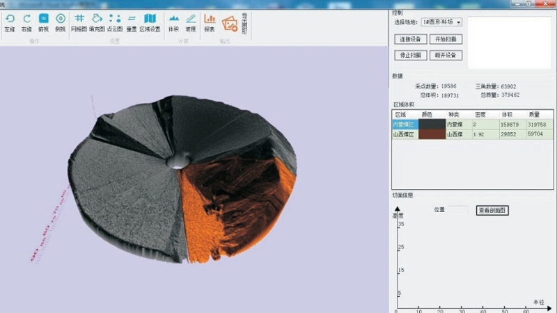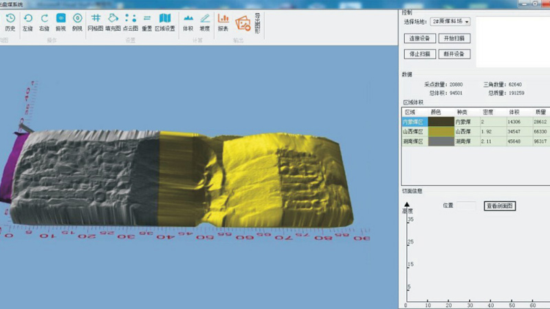 Laser intelligent measurement and control system adopts gray Line positioning technology and laser scanner technology, achieving three-dimensional point cloud data.The stereo shape of material pile can be restored by using high simulation VR technology and the volume of any material area can be calculated by the principle of calculus. Meanwhile, the height of material position at any point is the core data to automatic material piling and taking in unmanned material yard.